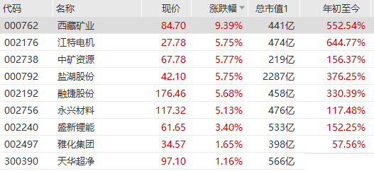 锂矿板块继续走高,西藏矿业大涨超9%,江特电机、中矿资源、盐湖股份、融捷股份等涨超5%,盛新锂能、雅化集团等跟涨。 昨日龙虎榜数据显示,机构资金、北向资金青睐多只板块个股。其中,3天2板盛新锂能获北向资金抢筹1.55亿,两个机构席位合计买入1.45亿元;江特电机获两个机构席位合计买入1.65亿元;西