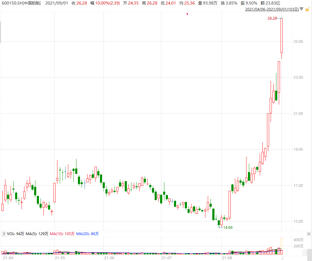 中船系个股集体走强,中国船舶再度涨停,报26.28元,创逾2年新高,8月以来累计涨幅近80%;中船科技、中船防务、亚星锚链等跟随拉升。 昨日,中国船舶集团有限公司召开“十四五”规划发布会,正式发布《中国船舶集团有限公司“十四五”规划》。会议指出,“十四五”规划的发布,标志着中国船舶集团开启了