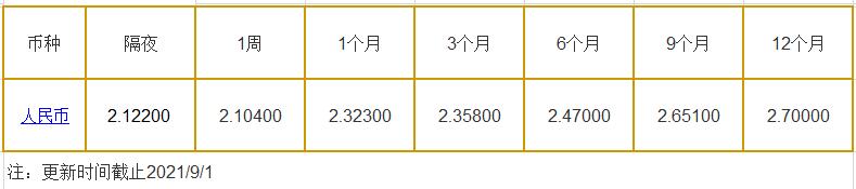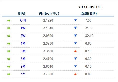 9月1日中国银行间同业拆借利率人民币: 隔夜报2.12200%, 1周期报2.10400%, 1月期报2.32300%, 12月期报2.70000%。 中国银行同业拆放利率(ChiaItrakOffrdRat,简称CHIOR)。同业拆借利率指金融机构同业之间的短期资金借贷利率。它有两个利率,拆进利率表示金融机构