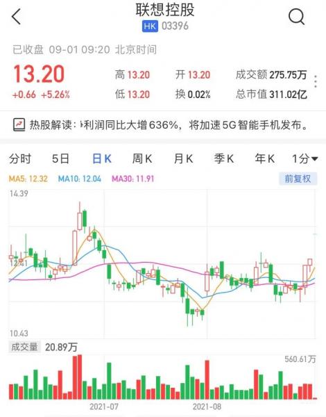 联想控股(3396.HK)高开5.26%,现报13.2港元,最新市值311亿港元。 联想控股昨日盘后公布中期业绩称,期内公司及其附属公司收入为2285.65亿元(人民币,下同),同比上升24%,自2017年以来连续第9个报告期实现增长;公司权益持有人应占净利润为46.91亿元,同比上升636%;每股基本盈利为人民币2.01元。战略