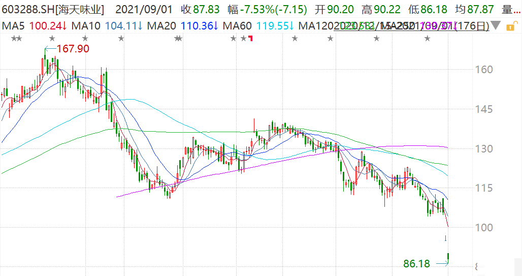继昨日跌停后,海天味业今早再度逼近跌停,一度跌至86.18元,股价创2020年6月以来新低,市值3630亿元。公司8月30日晚公布的业绩显示,上半年营收123.32亿元,同比增6.36%;归母净利润33.53亿元,同比增3.07%。无论是营收还是净利,海天味业业绩增速均创上市以来新低。另外,二季度单季营收净利双降。 海
