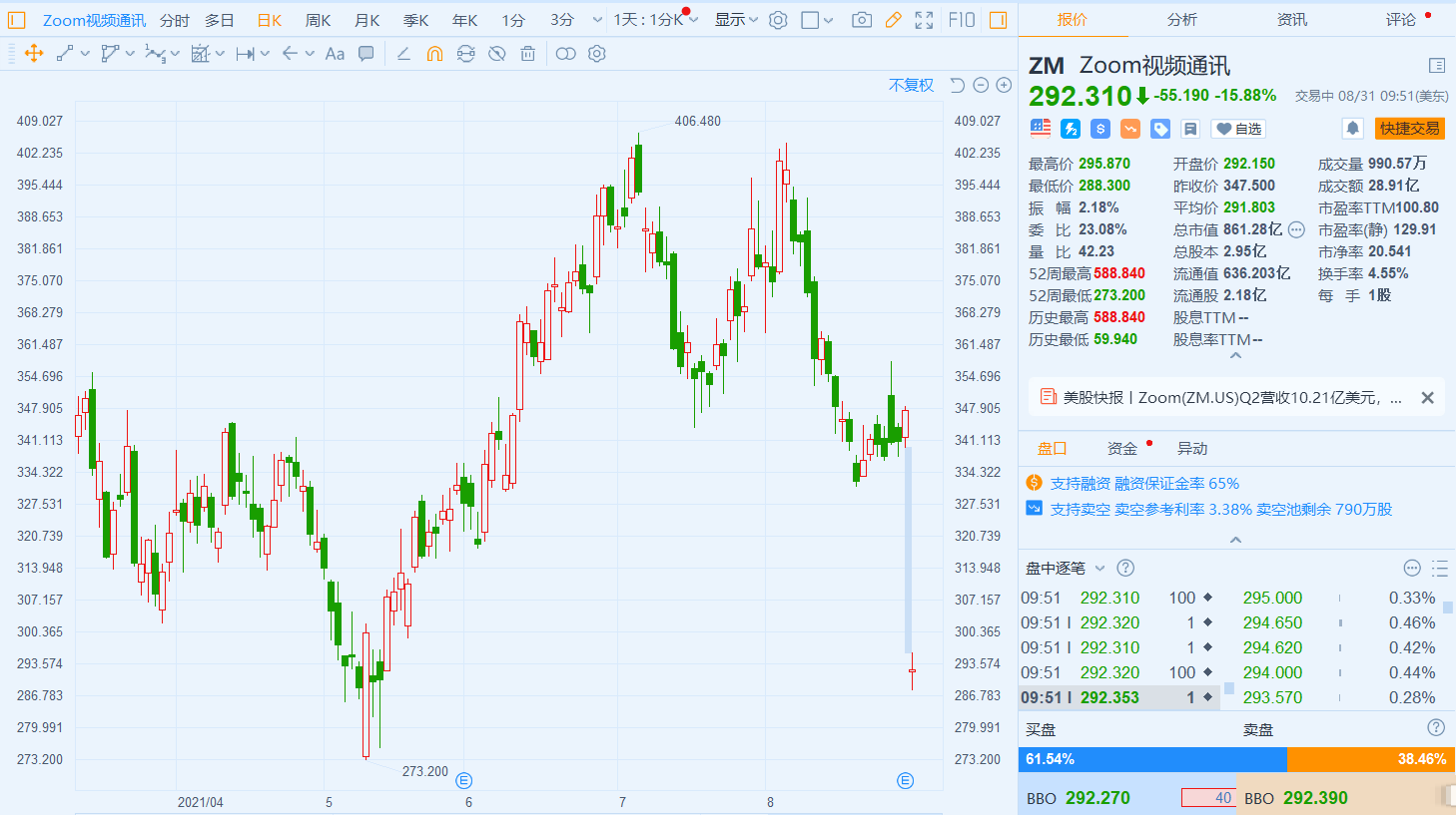 Zoo(Z.U)今日股价大幅低开,现跌15.88%,报282.31美元,暂成交28.91亿美元,最新总市值为861.28亿美元。 Zoo财报显示,公司二季报营收10.2亿美元,同比增长54%;归属股东净利润3.16亿美元,去年同期为1.85亿美元。公司本季度的营收增速较上一季度放缓,且给出下一季度增长指引仅为31%。公司绩后遭多