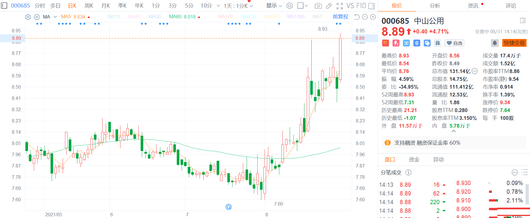 中山公用(000685.Z)涨4.71%,报8.89元,高见8.93元创年内新高,总市值131亿元。 中山公用披露2021年半年度报告,报告期内,公司实现营业收入11.50亿元,同比增长28.91%;归属于上市公司股东的净利润8.08亿元,同比增长14.93%;归属于上市公司股东的扣除非经常性损益的净利润8.04亿元,同比增长14.93%;