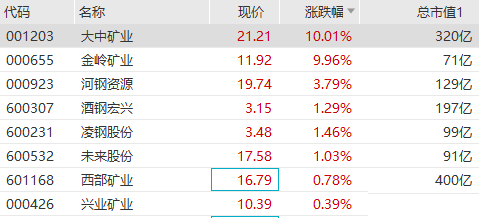 铁矿石板块大幅走高,大中矿业、金岭矿业双双涨停,河钢资源、酒钢宏兴、兴业矿业等跟涨。 日前,自然资源部回复委员的提案,明确支持国内铁矿石资源的开发。答复函称,下一步,我部将继续强化基础地质工作,将铁矿列为战略性矿产国内找矿行动主攻矿种,以规模大、易采选的“鞍山式”沉积变质型铁矿、“