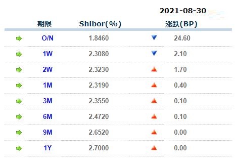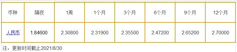 8月30日中国银行间同业拆借利率人民币: 隔夜报1.84600%, 1周期报2.30800%, 1月期报2.31900%, 12月期报2.70000%。 中国银行同业拆放利率(ChiaItrakOffrdRat,简称CHIOR)。同业拆借利率指金融机构同业之间的短期资金借贷利率。它有两个利率,拆进利率表示金融机构