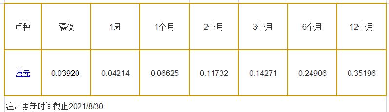 8月30日香港银行间同业拆借利率港币: 隔夜报0.03920%, 1周期报0.04214%, 1月期报0.06625%, 12月期报0.35196%。 香港银行同业拆放利率HIOR(HogkogItrakOffrdRat),指香港货币市场上,银行与银行之间的一年期以下的短期资金借贷利率,是从伦敦同业拆借利率(LIOR)