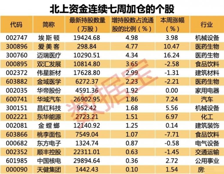 最新数据显示,北上资金共持有2258只个股,合计持股量983.04亿股,相比上周末,持股总量增加10.52亿股,环比增幅为1.08%。近期硅片价格再度呈现密集上涨的趋势,光伏概念股因此成为北上资金最爱,龙头股隆基股份也成为本周最热的股票,股价上涨,市值超过4900亿元。北上资金连续7周买入16股,从持股比例变动情况来看