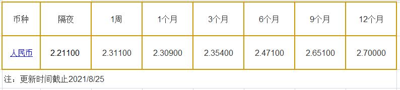 8月25日中国银行间同业拆借利率人民币: 隔夜报2.21100%, 1周期报2.31100%, 1月期报2.30900%, 12月期报2.70000%。 中国银行同业拆放利率(ChiaItrakOffrdRat,简称CHIOR)。同业拆借利率指金融机构同业之间的短期资金借贷利率。它有两个利率,拆进利率表示金融机构