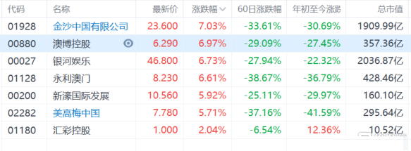 濠赌股全线上涨,金沙中国(1928.HK)涨超7%领涨,澳博控股、银河娱乐、永利澳门均涨超6%,新濠国际、美高梅中国涨超5%。 澳门新型冠状病毒感染应变协调中心宣布,自本周三(25日)凌晨起,经粤澳口岸出入境人士,由目前须持48小时内新冠病毒核酸测试阴性结果证明,放宽至须持7天内核酸阴性结果证明。经其他
