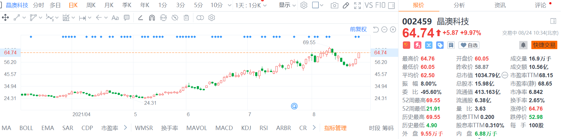 晶澳科技(002459.Z)接近涨停,报64.74元,最新总市值1034.8亿。 公司昨日披露2021年度非公开发行股票预案,拟向不超35名特定投资者发行股份,募集资金总额不超过50亿元,扣除发行费用后将全部用于年产20GW单晶硅棒和20GW单晶硅片项目、高效太阳能电池研发中试项目及补充流动资金。