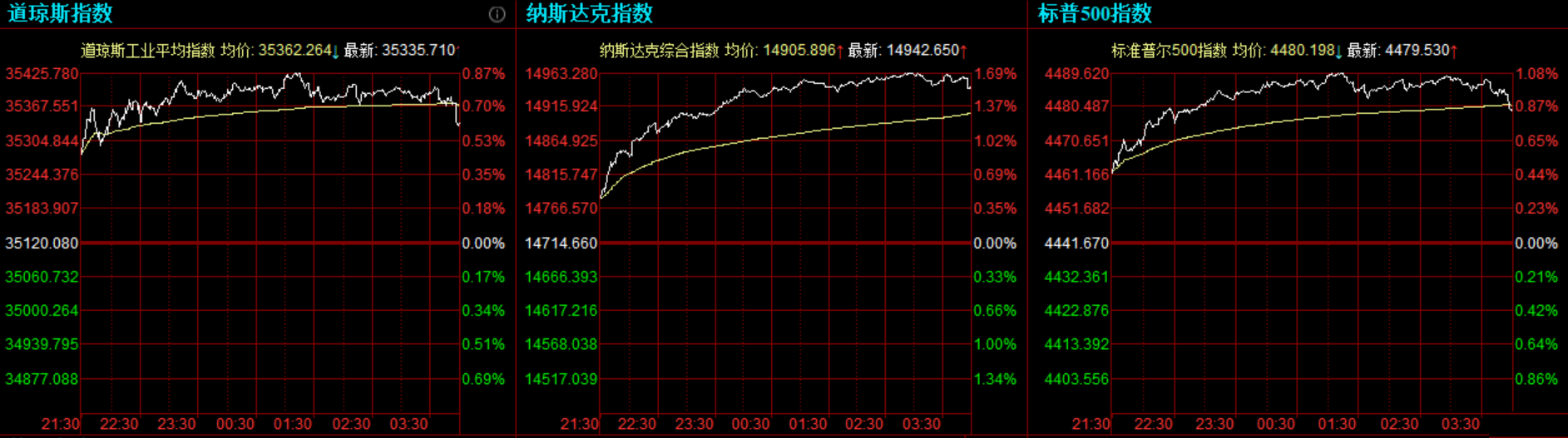 美国股市三大股指全线上扬,纳指创收盘历史最高纪录。受FDA首次全面批准一款新冠疫苗消息提振,重新开放概念股普遍攀升。市场聚焦本周的美联储杰克逊霍尔年会,希望从中寻找有关缩减购债计划的线索。 道指收涨215.63点,或0.61%,报35335.71点;纳指涨227.99点,或1.55%,报14942.65点;标普500指数涨37