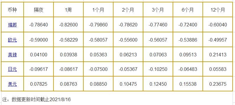 8月16日伦敦银行同业拆借利率: 隔夜LIOR:瑞郎报-0.78640%,欧元报-0.59000%,英镑报0.04100%,日元报-0.09617%,美元报0.07825%; 1周LIOR:瑞郎报-0.82600%,欧元报-0.58229%,英镑报0.03938%,日元报-0.08617%,美元报0.08763%; 1个月LIOR:瑞郎报-0.79860%,欧元报-0.58057%,英镑报0.053