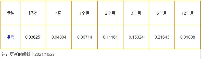 10月27日香港银行间同业拆借利率港币: 隔夜报0.03625%, 1周期报0.04304%, 1月期报0.06714%, 12月期报0.31808%。 香港银行同业拆放利率HIOR(HogkogItrakOffrdRat),指香港货币市场上,银行与银行之间的一年期以下的短期资金借贷利率,是从伦敦同业拆借利率(LIOR)