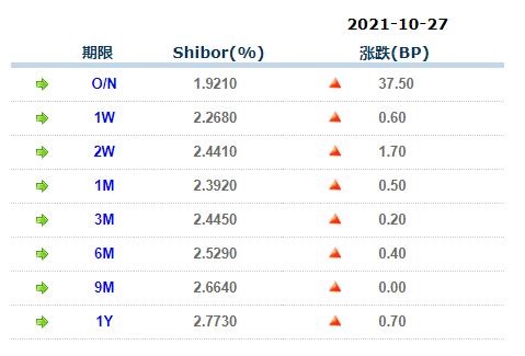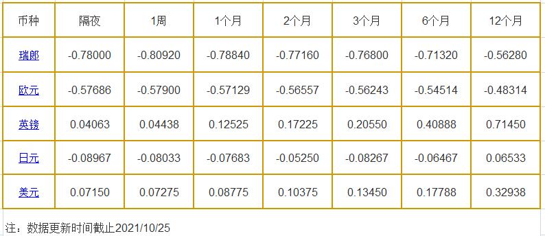 10月25日伦敦银行同业拆借利率: 隔夜LIOR:瑞郎报-0.78000%,欧元报-0.57686%,英镑报0.04063%,日元报-0.08967%,美元报0.07150%; 1周LIOR:瑞郎报-0.80920%,欧元报-0.57900%,英镑报0.04438%,日元报-0.08033%,美元报0.07275%; 1个月LIOR:瑞郎报-0.78840%,欧元报-0.57129%,英镑报0.12