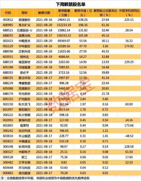 数据显示,下周8月16日至20日,沪深两市限售股数量共计47亿股,以13日收盘价计算,市值约1299.63亿元,均较本周环比有所减少。其中,解禁数量较大的个股有淮北矿业、龙腾光电、中粮资本、恩捷股份、芯原股份、正帆科技、中环股份等。 淮北矿业、龙腾光电下周限售股解禁数量均超过15亿股,淮北矿业本次上市流通