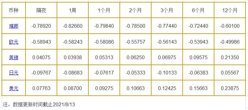 8月13日伦敦银行同业拆借利率: 隔夜LIOR:瑞郎报-0.78920%,欧元报-0.58943%,英镑报0.04075%,日元报-0.09767%,美元报0.07763%; 1周LIOR:瑞郎报-0.82660%,欧元报-0.58243%,英镑报0.03938%,日元报-0.08683%,美元报0.08700%; 1个月LIOR:瑞郎报-0.79840%,欧元报-0.58086%,英镑报0.053