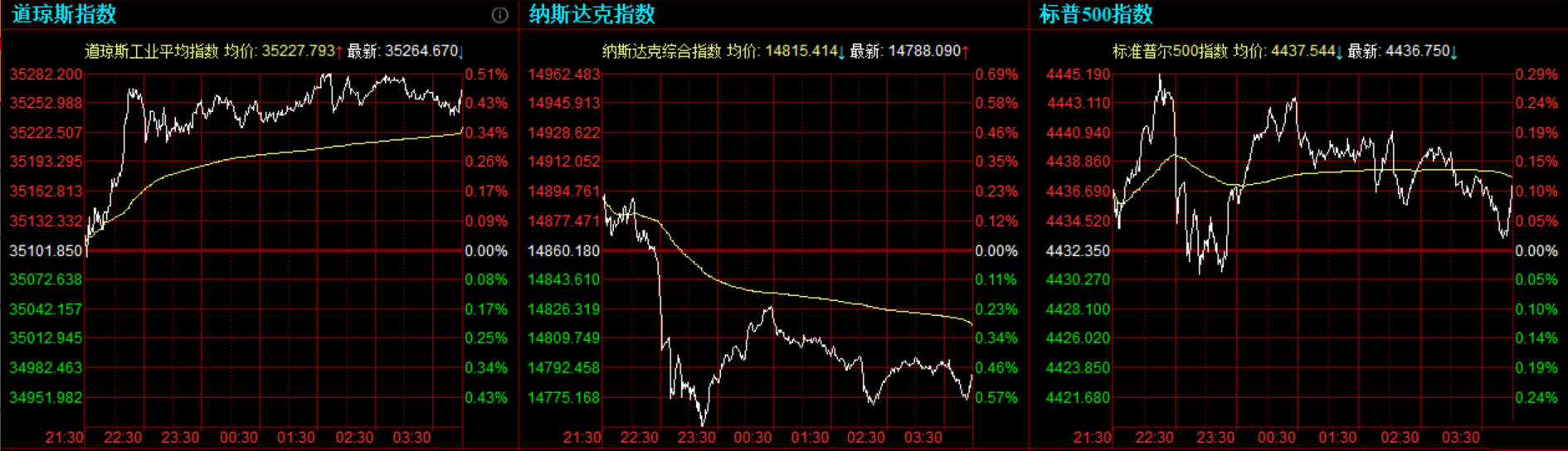 随着美国参议院轻松通过两党议员提出的万亿基建投资法案,周二道指、标普500指数再创收盘历史新高,纳指则全天走弱。氢能、锂电等清洁能源板块及基建板块集体走强。 道指收涨162.82点,或0.46%,报35264.67点;纳指跌72.09点,或0.49%,报14788.09点;标普500指数涨4.40点,或0.1%,报4436.75点。道指最高上涨