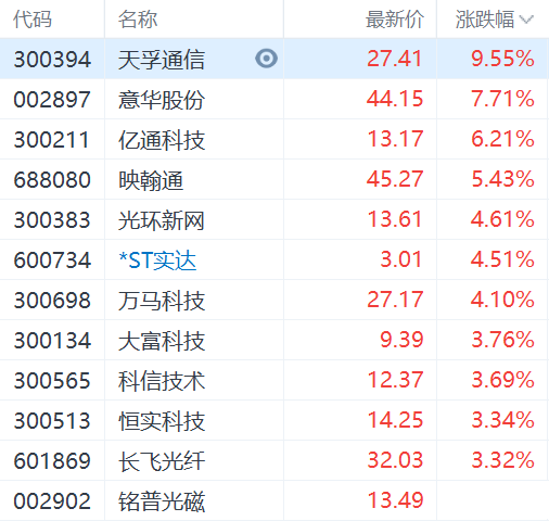信维通信涨超11%,天孚通信涨超9%,亿通科技涨超6%,汇源通信、吉大通信等纷纷上涨。