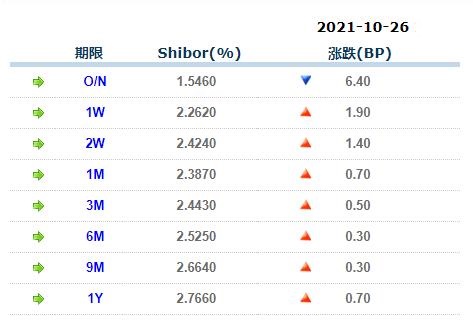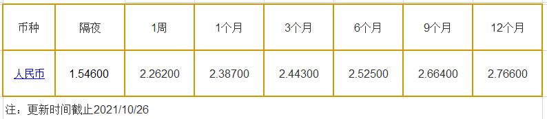10月26日中国银行间同业拆借利率人民币: 隔夜报1.54600%, 1周期报2.26200%, 1月期报2.38700%, 12月期报2.76600%。 中国银行同业拆放利率(ChiaItrakOffrdRat,简称CHIOR)。同业拆借利率指金融机构同业之间的短期资金借贷利率。它有两个利率,拆进利率表示金融机
