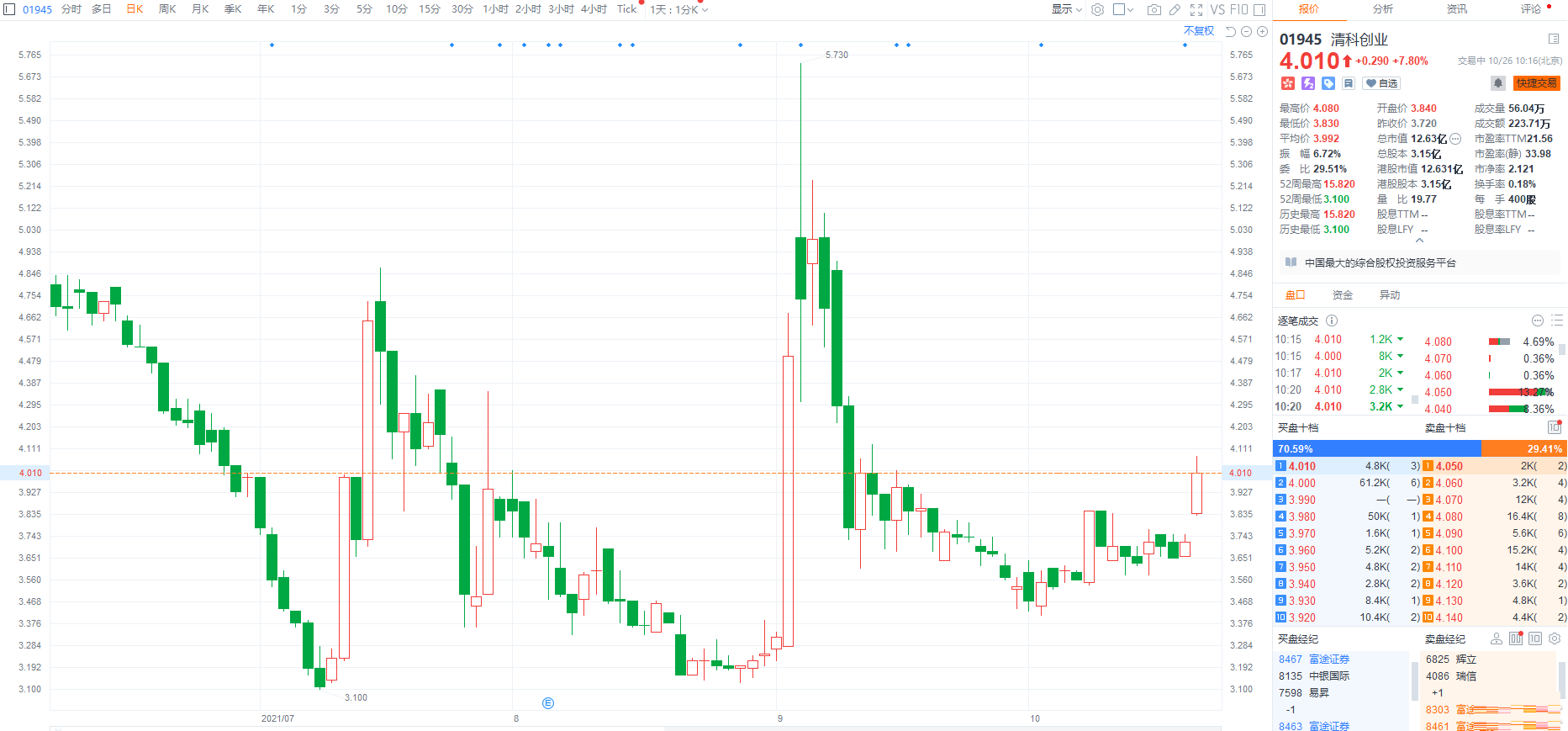 清科创业(1945.HK)大涨近8%,报4.01港元,高见4.08港元创约一个半月以来新高,总市值13亿港元。 清科创业昨日盘后宣布,其拟根据公司股于2021年6月4日举行的股东周年大会上授出的一般授权行使其权力,于适当时候在公开市场回购最多3060万股公司股份(即于2021股东周年大会日期已发行股份总数的10%。目前