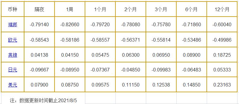 8月5日伦敦银行同业拆借利率: 隔夜LIOR:瑞郎报-0.79140%,欧元报-0.58543%,英镑报0.04138%,日元报-0.09667%,美元报0.07900%; 1周LIOR:瑞郎报-0.82660%,欧元报-0.58186%,英镑报0.04150%,日元报-0.08950%,美元报0.08750%; 1个月LIOR:瑞郎报-0.79720%,欧元报-0.58557%,英镑报0.0547
