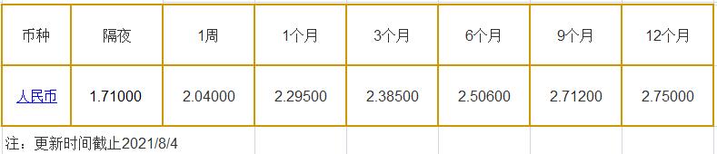 8月4日中国银行间同业拆借利率人民币: 隔夜报1.71000%, 1周期报2.04000%, 1月期报2.29500%, 12月期报2.75000%。 中国银行同业拆放利率(ChiaItrakOffrdRat,简称CHIOR)。同业拆借利率指金融机构同业之间的短期资金借贷利率。它有两个利率,拆进利率表示金融机构