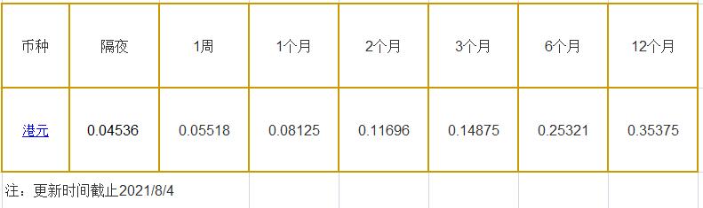 8月4日香港银行间同业拆借利率港币: 隔夜报0.04536%, 1周期报0.05518%, 1月期报0.08125%, 12月期报0.35375%。 香港银行同业拆放利率HIOR(HogkogItrakOffrdRat),指香港货币市场上,银行与银行之间的一年期以下的短期资金借贷利率,是从伦敦同业拆借利率(LIOR)变