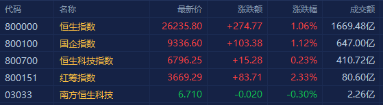 港股三大指数全线收涨,恒指涨1.06%报26235点,国指涨1.12%报9336点,恒生科技指数涨0.23%报6796点。 盘面上,重型机械股强势崛起,中国重汽大涨14%;恒大系全天表现强势,恒腾网络暴涨48%;建材水泥股、汽车股、港口航运股、纸业股、电池股、光伏股、电力股、中资券商股、内房股、乳业等板块齐涨,比亚