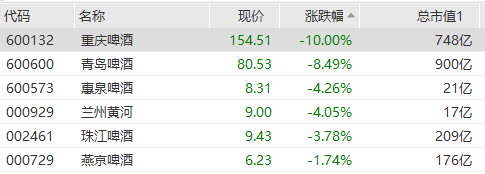 啤酒板块午后跌势扩大,重庆啤酒跌停,青岛啤酒跌超8%,惠泉啤酒、兰州黄河、珠江啤酒等跟跌。港股方面,青岛啤酒股份跌超8%,华润啤酒跌超6%。摩根大通表示,啤酒厂商的高端化进程会对短期营收造成负面影响。