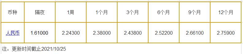 10月25日中国银行间同业拆借利率人民币: 隔夜报1.61000%, 1周期报2.24300%, 1月期报2.38000%, 12月期报2.75900%。 中国银行同业拆放利率(ChiaItrakOffrdRat,简称CHIOR)。同业拆借利率指金融机构同业之间的短期资金借贷利率。它有两个利率,拆进利率表示金融机