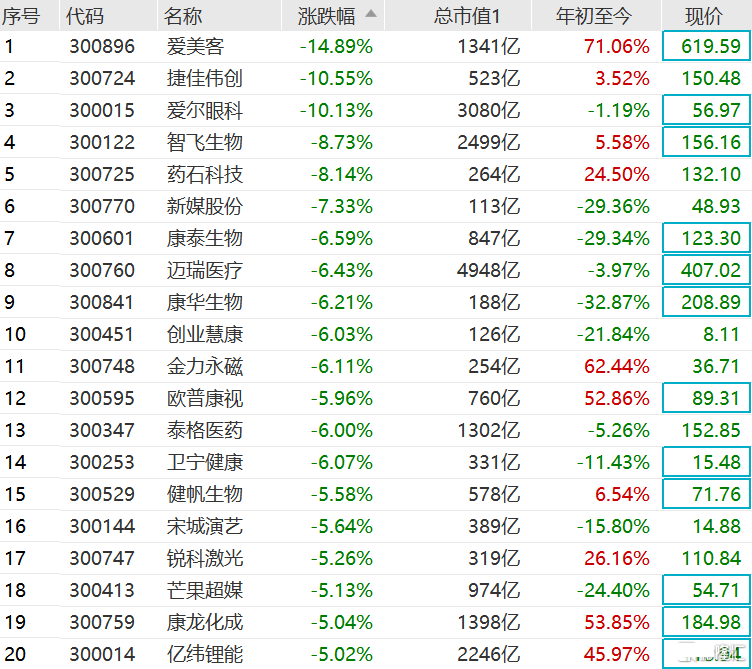 A股午后跌幅进一步扩大,其中,创业板指大跌3.49%。成分股中,爱美客跌近15%,捷佳伟创和爱尔眼科跌超10%,智飞生物、药石科技跌超8%,新媒股份跌超7%,康泰生物、迈瑞医疗、康华生物和创业慧康跌超6%,宁德时代、金龙鱼和汇川技术跌超3%。