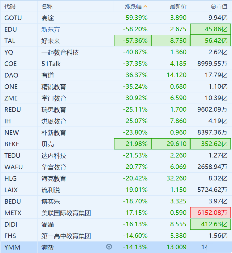 高途跌59%,新东方跌58%,好未来跌57%,有道跌36%,贝壳跌21%,滴滴跌16%,36氪跌12%,雾芯科技跌近10%,富途、每日优鲜跌超9%,叮咚买菜、红黄蓝、O直聘跌超8%,拼多多、网易、理想汽车跌超5%,阿里巴巴、京东、小鹏汽车跌超4%。