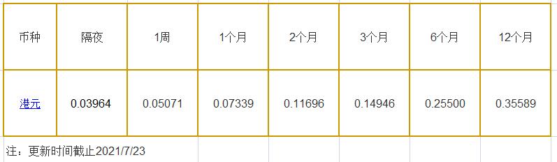 7月23日香港银行间同业拆借利率港币: 隔夜报0.03964%, 1周期报0.05071%, 1月期报0.07339%, 12月期报0.35589%。 香港银行同业拆放利率HIOR(HogkogItrakOffrdRat),指香港货币市场上,银行与银行之间的一年期以下的短期资金借贷利率,是从伦敦同业拆借利率(LIOR)