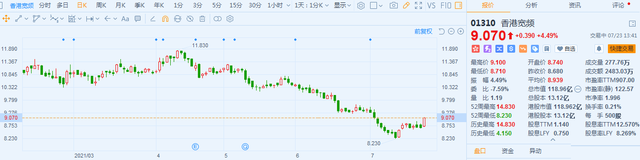 香港宽频(1310.HK)股价高位震荡,现报9.07港元,涨幅4.49%,最新总市值118.96亿港元。 资料显示,该股在7月20日获ThCaitalGrouCoaiIc.在场内以每股均价8.748港元增持762.95万股。完成后,其最新持股数目为9767.1万股,持股比例由6.87%上升至7.45%。