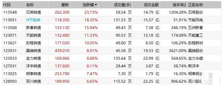 中证转债指数午盘涨0.47%,石英转债涨超23%,“节能转”涨超18%,两只债券均盘中临停;新春转债涨近16%,天能转债涨超11%,彤程转债涨超10%,晶瑞转债涨近9%,金力转债和洋丰转债均涨逾8%;中天转债跌近12%,天铁转债跌超8%,道氏转债跌逾5%。