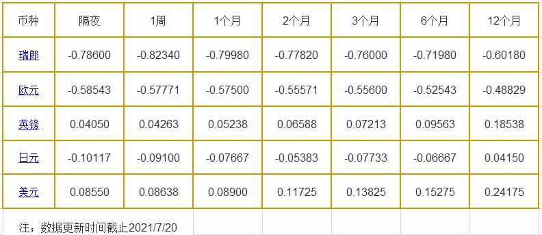 7月20日伦敦银行同业拆借利率: 隔夜LIOR:瑞郎报-0.78600%,欧元报-0.58543%,英镑报0.04050%,日元报-0.10117%,美元报0.08550%; 1周LIOR:瑞郎报-0.82340%,欧元报-0.57771%,英镑报0.04263%,日元报-0.09100%,美元报0.08638%; 1个月LIOR:瑞郎报-0.79980%,欧元报-0.57500%,英镑报0.052