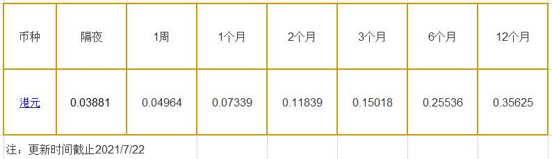 7月22日香港银行间同业拆借利率港币: 隔夜报0.03881%, 1周期报0.04964%, 1月期报0.07339%, 12月期报0.35625%。 香港银行同业拆放利率HIOR(HogkogItrakOffrdRat),指香港货币市场上,银行与银行之间的一年期以下的短期资金借贷利率,是从伦敦同业拆借利率(LIOR)