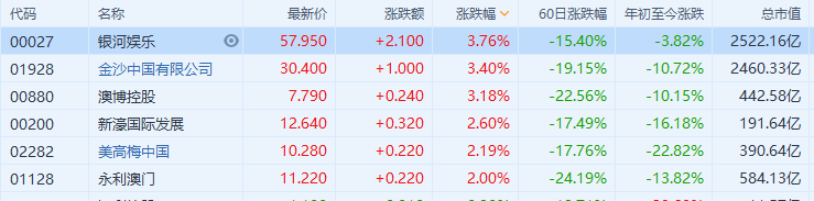 濠赌股走强,银娱、金沙、澳博均涨超3%,新濠国际、美高梅中国涨超2%。个股方面,金沙中国2021年第二季的净收益总额同比增长20.2倍至8.49亿美元;第二季的净亏损为1.66亿美元,较去年同期的5.49亿美元收窄。板块上,摩通近日发研报指,尽管由年初至今,濠赌股的股价已调整了14%,但该行仍然看好澳门**业,予六只濠赌