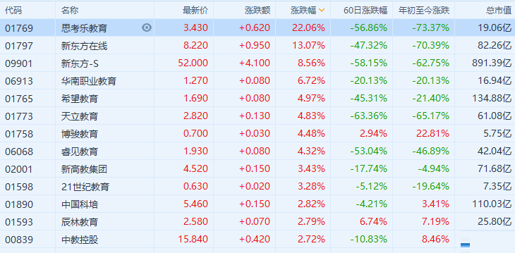 教育股延续昨日强势,思考乐教育(1769.HK)大涨22%领涨,新东方在线涨13%,新东方涨超8%,希望教育、天立教育、睿见教育涨超4%。三孩配套政策来临,《中共中央国务院关于优化生育政策促进人口长期均衡发展的决定》前日(20日)晚间正式公布。此外,教育部等六部门印发意见部署教育新型基础设施建设,《意见》提出,要充