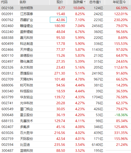 锂电池板块再度走强,沧州明珠涨停,江苏国泰涨超8%,赣锋锂业涨超7%再创历史新高,盛新锂能涨超6%,天齐锂业、雅化集团、恩捷股份、天赐材料等跟涨。天风证券研报指出,2021年多家下游锂电企业均进行了大规模的扩产,锂电设备戴维斯双击有望即将来临。由于锂电设备普遍产能紧张,终端订单逐步扩散至二线厂商。据统计