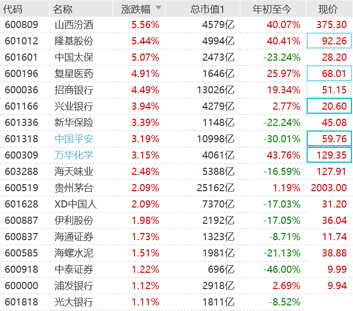 A股市场保险和银行股表现强势,带动上证50指数涨幅扩大至近2%,领跑一众指数。成分股中,山西汾酒、隆基股份、中国太保涨超5%领涨,复星医药、招商银行涨超4%,兴业银行、新华保险、中国平安和万华化学涨超3%,中国人寿涨超2%。 今年首次全面降准7月15日落地实施。央行决定于今日下调金融机构存款准备金率0.5个
