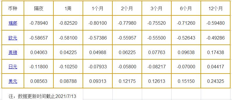7月13日伦敦银行同业拆借利率: 隔夜LIOR:瑞郎报-0.78940%,欧元报-0.58657%,英镑报0.04063%,日元报-0.11800%,美元报0.08563%; 1周LIOR:瑞郎报-0.82520%,欧元报-0.58100%,英镑报0.04225%,日元报-0.10250%,美元报0.08788%; 1个月LIOR:瑞郎报-0.80100%,欧元报-0.57386%,英镑报0.049