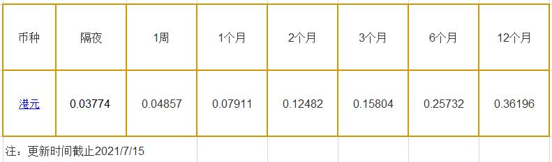 7月15日香港银行间同业拆借利率港币: 隔夜报0.03774%, 1周期报0.04857%, 1月期报0.07911%, 12月期报0.36196%。 香港银行同业拆放利率HIOR(HogkogItrakOffrdRat),指香港货币市场上,银行与银行之间的一年期以下的短期资金借贷利率,是从伦敦同业拆借利率(LIOR)