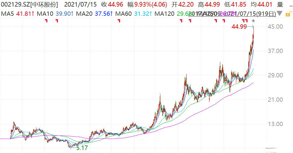 中环股份(002129.Z)涨停报44.99元,创历史新高,市值超1300亿元。 公司发布业绩预告显示,预计上半年营收170亿元-180亿元,比上年同期增长96.66%-108.23%;预计归属于上市公司净利润14亿元-15.5亿元,比上年同期增长160.06%-187.93%。机构指出,今年上半年光伏产业链博弈加剧,在硅料价格加速上行的背
