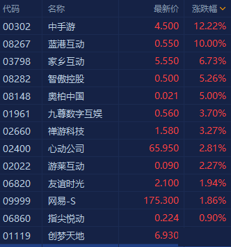 港股手游股全线拉升上扬,中手游涨幅扩大至超12%创历史新高,家乡互动涨超6%,心动公司涨近3%,网易、创梦天地均有涨幅。 数据显示,中国游戏产品逐渐占据东南亚移动游戏市场较大比重,2021年1-6月东南亚移动游戏市场近5成流水来自中国游戏企业自研产品。其中,中手游发行的《新射雕群侠传之铁血丹心》