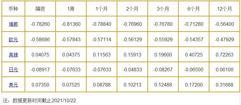 10月22日伦敦银行同业拆借利率: 隔夜LIOR:瑞郎报-0.78260%,欧元报-0.58686%,英镑报0.04075%,日元报-0.08917%,美元报0.07350%; 1周LIOR:瑞郎报-0.81360%,欧元报-0.57843%,英镑报0.04375%,日元报-0.07633%,美元报0.07525%; 1个月LIOR:瑞郎报-0.78840%,欧元报-0.57114%,英镑报0.11