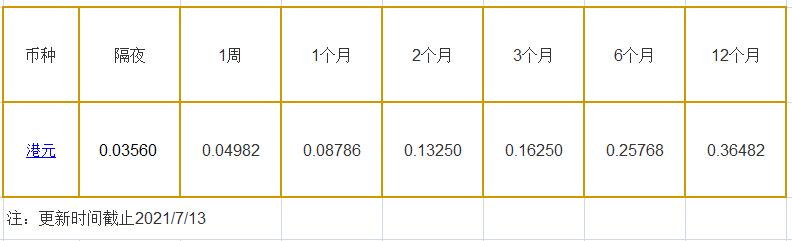 7月13日香港银行间同业拆借利率港币: 隔夜报0.03560%, 1周期报0.04982%, 1月期报0.08786%, 12月期报0.36482%。 香港银行同业拆放利率HIOR(HogkogItrakOffrdRat),指香港货币市场上,银行与银行之间的一年期以下的短期资金借贷利率,是从伦敦同业拆借利率(LIOR)