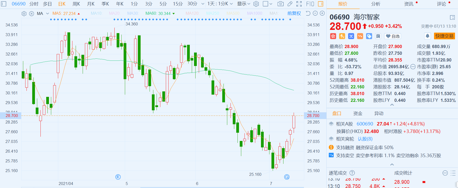 海尔智家(6690.HK)涨3.42%,报28.7港元;海尔智家(600690.H)更是涨近5%,报27.04元。 根据联交所最新权益披露资料显示,2021年7月8日,海尔智家(06690.HK)获HairGrouCororatio在场内以每股均价人民币25.08元增持127.26万股A股,涉资约人民币3191.76万元。增持后,HairGrouCororatio最新持股数