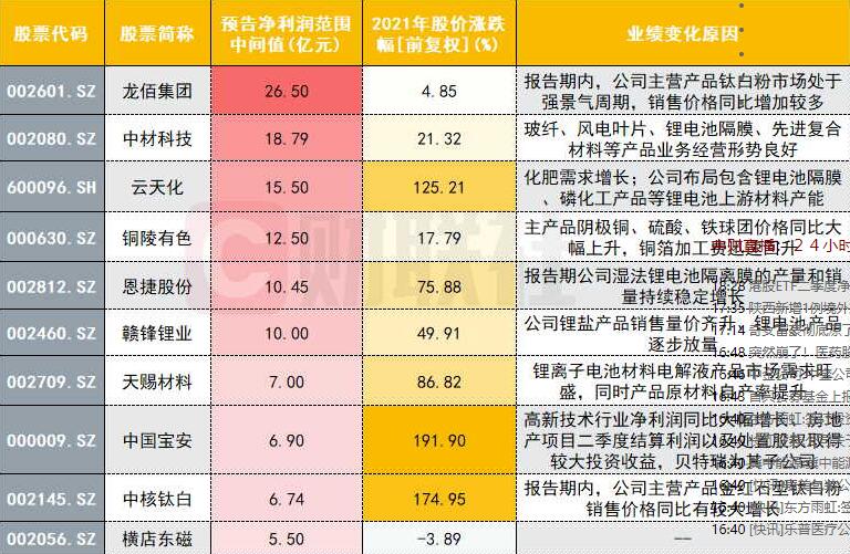 近期资本市场锂电产业链迎来大爆发,本周内,新能源产业链与资源股持续大涨,行情还发散至锂电各细分赛道。时值中报季,截至7月9日收盘,200余只锂电池产业链相关个股中,已有51只发布了中期业绩预告,财联社对以上个股交出的中报“成绩单”进行盘点。 龙佰集团(原龙蟒佰利(002601))暂时以23.3-29.7亿元的中报