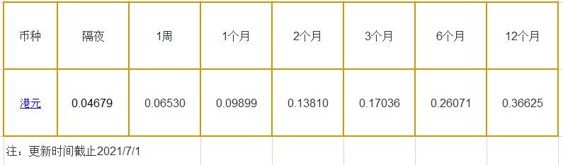 7月1日香港银行间同业拆借利率港币: 隔夜报0.04679%, 1周期报0.06530%, 1月期报0.09899%, 12月期报0.36625%。 香港银行同业拆放利率HIOR(HogkogItrakOffrdRat),指香港货币市场上,银行与银行之间的一年期以下的短期资金借贷利率,是从伦敦同业拆借利率(LIOR)变